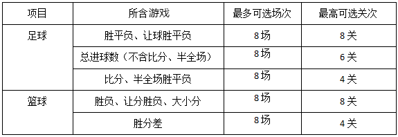 自由过关对最高过关场次的限制与游戏规则相同,即足球胜平负、让球胜平负,篮球大小分、胜负、让分胜负自由过关最多可选8关;足球总进球数最多可选6关;足球比分、半全场胜平负,篮球胜分差最多可选4关。